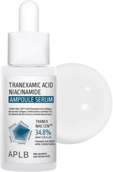 APLB Tranexamic Acid Niacinamide Ampoule Serum — világosító szérum tranexámsavval és niacinamiddal a pigmentáció, a post-akne jelek elleni küzdelemhez, valamint a bőr textúrájának javításához. Fő tulajdonságok: