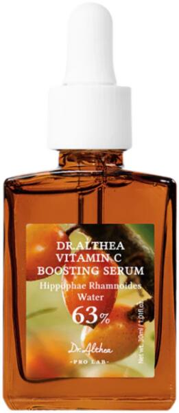 A Dr. Althea C-vitamin Boosting szérum a bőr belülről történő revitalizálására összpontosít, hogy erőteljes ragyogást és mély hidratálást biztosítson.  A Hippophae Rhamnoides vízzel és Tranexaminsavval formulázott szérum javítja a fakó és egyenetlen bőrtónust. 63% Hippophae Rhamnoides Water-t tartalmaz, egy C-vitaminban gazdag természetes összetevőt, amely erőteljes ragyogó hatást biztosít, ugyanakkor enyhébb, mint a hagyományos C-vitaminos szérumok, így érzékeny bőrre is alkalmas. A szérum emellett Centella Asiatica levélvizet és nyolcféle hialuronsavat is tartalmaz, amelyek nemcsak a felszínt, hanem a bőr belsejét is mélyen hidratálják, hatékonyan nyugtatva a külső tényezők által érintett, fáradt bőrt. A mesterséges színezékek és illatanyagok nélkül összeállított szérum tökéletes az érzékeny bőr számára, bőrbarát és gyengéd, szintetikus adalékanyagoktól mentes élményt nyújt. Kellemetlen szagok és elszíneződések nélkül, zökkenőmentesen szívódik be a bőrbe, így ideális napi ápoló, amely könnyen alkalmazható sminkelés előtt vagy lefekvés előtt. Fő összetevők: Homoktövis Centella AsiaticaC VitaminNiacinamidPanthenol Hialuronsav Haszná lat : A cseppentő segítségével adagolj kis mennyiségű szérumot, majd egyenletesen vidd a fel az arcodra, a közepétől kezdve kifelé haladva. Befejezésül finoman kopogtasd meg a bőröd, hogy biztosítsd a teljes felszívódást. Használj fényvédőt: Ha napközben alkalmazod a C-vitaminos szérumot, ne feledd, hogy utána fényvédő krémet is használj.