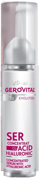 Gerovital H3 Evolution szérum hialuronsavval 6%-os koncentrációban, 10 mlTiszta hialuronsavban és liposzómás 6%-ban, liposzómás C-vitaminban, SOD-ban, GP4G-ben és Trylagenben gazdag szérum, amely öregedésgátló, ráncfeltöltő és simító hatású, helyreállítja a bőrgát védőfunkcióját és intenzíven hidratál. A Hyaluronsav 6%-os koncentrált szérum alacsony és magas molekulasúlyú hialuronsavban gazdag szérum. Használat: A szérumot reggel és este használjuk, két-három cseppet vigyünk fel az arcra tisztítás és tonizálás után. Kombinálja a napi karbantartó krémmel.