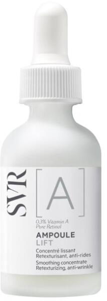 Koncentrált retexturizáló szérum SVR A Lift, 30 ml Tulajdonságok: a bőrszövet újratextúrája a bőr simítása érdekében; tökéletlen, kitágult pórusú, ráncos bőrre; a bőr napról napra visszanyeri tulajdonságait, javul a bőr állapota, halványulnak az öregedés jelei; klinikailag igazolt hatékonyság 7 nap után; nem komedogén, bőrgyógyászati ellenőrzés mellett tesztelt. Aktív összetevők: A-vitamin - tiszta és kronomentes retinol 0,3% - referencia ránctalanító hatóanyagok, amelyek regenerálják az epidermiszt. Használat módja: Reggel vagy este a napi ápolókrém előtt, vagy közvetlenül a krémbe keverve. Kerülje a szembe jutást.