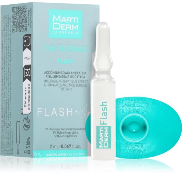 MartiDerm The Originals Flash, 2 ml, arc szérumok nőknek, A kiváló minőségű MartiDerm The Originals arcszérum magas aktívanyag tartalmú készítmény. Ennek köszönhetően a legfényűzőbb módon ápolja az arcbőrét. Tulajdonságok: segít kisimítani a ráncokat és a finom szarkalábakat hatékonyan hidratál és táplál eltávolítja a fáradság jeleit világosít Összetétel: bőrgyógyászatilag tesztelt Használata: Gyengéden ütögessen be az ujjaival megfelelő mennyiségű szérumot a tiszta arcbőrébe. Vigye fel az arcára, nyakára és a dekoltázsára is.