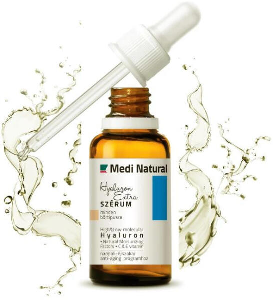 Hyaluron extra szérum - Hidratáló, ráncellenes anti-aging programhoz 30 ml Szeretnéd, ha sokáig fiatalos lenne a bőröd? A MediNatural hyaluron extra szérum a legjobb választás, ha koncentrált hatóanyagtartalmú hidratáló kozmetikumot keresel. Intenzíven hidratál, feltölt és rugalmasságot biztosít. A természetes bőrfiatalító alapanyagok puhává, üdévé és feszessé varázsolják az arcbőrt.