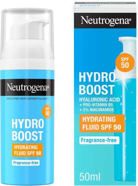 Neutrogena Hydro Boost SPF 50 hidratáló arckrém, 50 ml Ez a hidratáló arckrém magas szintű védelmet nyújt az UVA/UVB és a hosszú hullámhosszú UVA sugárzás ellen, serkenti a bőr létfontosságú hidratálását, és egyúttal erősíti a bőr természetes védőrétegét. Az egyedülálló, bőrgyógyászatilag tesztelt formula tartalmaz:Hialuronsav, amely segít a víz visszatartásában, így serkenti a hidratálástPro-vitamin B5 (panthenol), amely ismert a bőr hidratációs gátjának fenntartásáról2% niacinamid a textúra kiegyenlítésére és a foltok megjelenésének javításáraC- és E-vitamin antioxidánsok az UV-sugárzás okozta oxidatív stressz ellen. Minden bőrtípusra és bőrszínre alkalmas Nem komedogén. Láthatatlan, tapintásra száraz finis. Könnyű, nem ragadó textúra, bársonyos és ragyogó bőrt eredményez. 100% -ban újrahasznosítható csomagolás és doboz (ahol lehetséges). Összetevők: Aqua, C12-15 alkil-benzoát, etil-hexil-triazon, dietil-amino-hidroxi-benzoil-hexil-benzo át, kaprilil-metikón, diizopropil-adipát, alumínium-keményítő-oktenil-szukcin t, metilén-bis-benzotriazolil-tetrametil-b util-fenol (nano), niacinamid, Dimethicone, Diisopropyl Sebacate, Glycerin, Glyceryl Stearate, PEG-100 Stearate, Hydroxyacetophenone, Bis-Ethylhexyloxyphenol Methoxyphenyl Triazine, Potassium Cetyl Phosphate, Triacontanyl PVP, Decyl Glucoside, dimetikon-kopolimer, hidroxi-etil-akrilát/nátrium-akrilil-d imetil-taurat kopolimer, hidrolizált jojoba-észterek, titán-dioxid (nano), Nátrium-aszkorbil-foszfát, Dinátrium-EDTA, Tokoferil-acetát, Akrilátok/C10-30 alkil-akrilát keresztpolimer, Pentilén-glikol, Panthenol, Szilícium-dioxid, Nátrium-hialuronát, Jojoba-észterek, Nátrium-hidroxid, Propilén-glikol, Poliszorbát 60, Sorbitán-izostearát, Xantán gumi.
