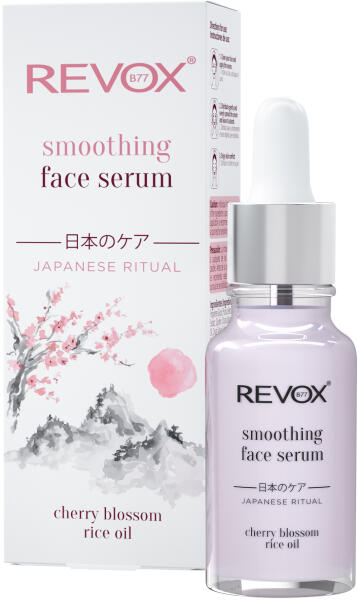 REVOX B77 JAPANESE ROUTINE SMOOTHING FACE SERUM   Tegye a napi bőrápolási rutinját pihentető szépségápolási rituálévá. A termékcsaládot a japán szépségrituálé és a fiatalos megjelenés titka ihlette. A cseresznyevirágok és festői rizsföldek országának illatát terjeszti. Bőre igényeihez igazítva, természetes, napi ritmusának megfelelően. Úgy tervezték, hogy optimális hidratáltságot biztosítson és lassítsa a bőr öregedési folyamatát. A finom, folyékony állagú formula az arcbőr azonnali kisimulásának és megemelésének benyomását kelti. A tápláló, méregtelenítő japán cseresznyevirág támogatja a bőr regenerálódását, védve azt a vízveszteségtől. A hialuronsav - a "fiatalság ikonikus forrása" megköti a vizet az epidermiszben, biztosítva a nedvességszint megfelelő egyensúlyát. Csökkenti a finom ráncok láthatóságát. A rizsolaj javítja a bőr rugalmasságát, az allantoin pedig kiegészíti a simítást. Ingredients Water / Aqua, Propylene Glycol, Cherry Blossom Extract / Prunus Serrulata Flower Extract, Glycerin, Rice Bran Oil / Oryza Sativa Bran Oil, Rice Extract / Oryza Sativa Extract, Hydrolyzed Rice Protein, Phenoxyethanol, Fragrance / Parfum, Ammonium Acryloyldimethyltaurate/VP Copolymer, Styrene/Acrylates Copolymer, Sodium Hyaluronate, Allantoin, Disodium EDTA, Citric Acid, Sodium Benzoate, Potassium Sorbate, Mica, Titanium Dioxide / CI 77891, Acid Red 33 / 17200. Folyamatosan fejlesztjük a receptúráinkat, ezért a weboldalon és a csomagoláson feltüntetett összetevők listájában a vásárlás időpontjától és régiójától függően eltérések lehetnek. Ellenőrizze az összetevők listáját a csomagoláson. Használata: 1) Tisztítsa meg az arcát, és vigye fel a szérumot. 2) Óvatosan és egyenletesen oszlasd el a szérumot, és hagyd felszívódni. 3) Élvezze a bőr kényelmét.