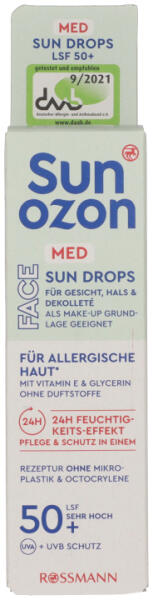 Sun ozon med nap-cseppek 30 ml arcea, nyakra, dekoltázsrasminkalapként is használható allergiás bőrre* e vitaminnal & glicerinnel 24 órás hidratáló ápolás & védelem egyben fényvédő faktor 50+ nagyon magas védelem uva + uvb védelem nagyon magas védelem a le nem barnult, napra érzékeny bőrnek -vízálló** -speciálisan az allergiás bőrre lett kifejlesztve -a rendkívül könnyű textúra gyorsan a bőrbe szívódik -bőrrel való összeférhetősége dermatológiailag tesztelt*a német allergia- és asztma szövetség tesztelte és ajánlja ** 40 perces vízben való tartózkodást követően a feltüntetett fényvédő faktor legalább 50%-ával tovább védi bőrétalkalmazás: a napvédő szert a napon való tartózkodás előtt bőségesen vigye fel bőrére. Csekély mennyiség felvitele esetén a védelem csökken. A védelem fenntartása érdekében gyakran ismételje a szer alkalmazását, különösen izzadás, úszás vagy törölközés után. Kerülje a déli tűző napsütést! csecsemőket és kisgyermekeket tartsa távol a közvetlen napsugárzástól. Védje bőrüket megfelelő öltözettel és magas védelmet nyújtó (25-ös fényvédőfaktorúnál magasabb) napozószerrel. A magas fényvédő faktorú napvédőszerek sem nyújtanak teljes védelmet az uv sugárzás ellen. Napvédő alkalmazása mellett se tartózkodjon túl hosszú ideig a napon. A túlzott napozás károsíthatja az egészséget! a napvédőszert hagyja teljesen a bőrébe szívódni. A textilekkel és felületekkel való érintkezést kerülni kell, tartós foltot okozhat. Bőrrel való érintkezés során tartós foltok és elváltozások még teljes beszívódást követően is előfordulhatnak. Szembe ne kerüljön!felhasználható: lásd a doboz alján