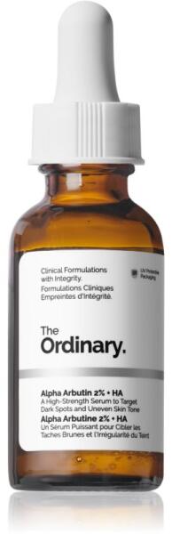 The Ordinary Alpha Arbutin 2% + HA, 30 ml, arc szérumok nőknek, A kiváló minőségű The Ordinary Alpha Arbutin 2% + HA arcszérum magas aktívanyag tartalmú készítmény. Ennek köszönhetően a legfényűzőbb módon ápolja az arcbőrét. Tulajdonságok: hatékonyan hidratál és táplál regenerálja az arcbőrt és megelőzi az irritáció kialakulását világosít megerősíti a bőrgátat hosszan tartó hatású helyreállítja a bőr rugalmasságát tömörré teszi az arcbőr Összetétel: vegán termék Használata: Gyengéden ütögessen be az ujjaival megfelelő mennyiségű szérumot a tiszta arcbőrébe. Vigye fel az arcára, nyakára és a dekoltázsára is.