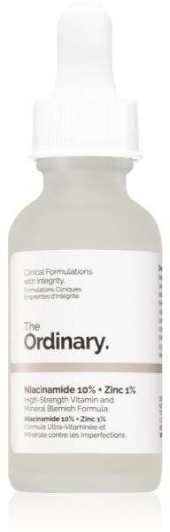 The Ordinary Niacinamide 10% + Zinc 1%, 30 ml, arc szérumok nőknek, Úgy érzi, hogy bőrének többre van szüksége, mint amit a krémek nyújtanak? A kiváló The Ordinary Niacinamide 10% + Zinc 1% arcszérum tökéletes kiegészítője bőrápolási rutinjának – kényezteti és intenzív ápolásban részesíti bőrét. A magas hatóanyag-koncentrációnak köszönhetően sokkal erőteljesebben és gyorsabban fejti ki hatását, mint egy arckrém. Ráadásul folyékony állaga megkönnyíti az alkalmazást, és nagyon jól beszívódik a bőrbe. Tulajdonságok: világosít finomít tömörré teszi az arcbőr visszaadja az arcbőr üdeségét és fiatalos szépségét Összetétel: vegán termék Használata: Gyengéden ütögessen be az ujjaival megfelelő mennyiségű szérumot a tiszta arcbőrébe. Vigye fel az arcára, nyakára és a dekoltázsára is. A szérumot nappali és/vagy éjszakai krém alá, esetleg önmagában is használhatja.