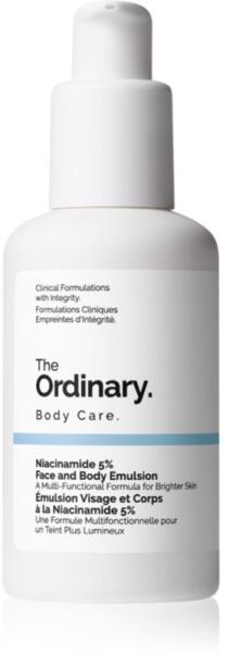The Ordinary Niacinamide 5% Face & Body Emulsion, 100 ml, arc szérumok nőknek, A rendszeres tisztítás mellett nemcsak az arcbőr, hanem a test bőre is megérdemli az ápolást a kiszáradás elkerülése érdekében. A hatékony The Ordinary Niacinamide 5% Face & Body Emulsion testápoló biztosítja a megfelelő hidratáltságot, táplálja a bőrt és segít megőrizni a szükséges nedvességet. Puhává, bársonyossá teszi a bőrt, és védelmet nyújt a kiszáradás ellen, amely a bőr húzódásával, kellemetlen érzéssel és a kiszáradt bőr hámlásával jár. Tulajdonságok: mélyrehatóan hidratálja a bőrt intenzíven táplál és lágyít biztosítja a hosszantartó hidratálását és rugalmasságát hatékonyan regenerálja a bőrt megerősíti a bőrgátat a pigmentfoltok csökkentése nem hagy fénylő, zsíros réteget a bőrön összehúzza a kitágult pórusokat finomít Használata: Vigyen fel megfelelő mennyiségű készítményt a tiszta bőrre, amennyiben lehetséges tusolás vagy fürdés után. Jól masszírozza be.